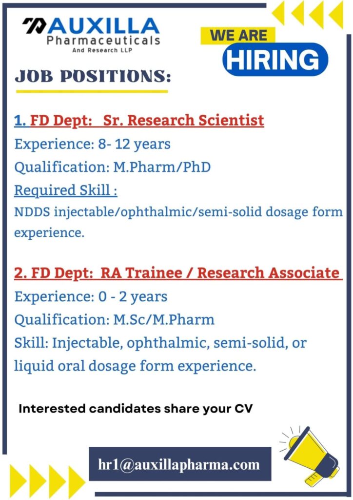 Are you a passionate and skilled professional in pharmaceutical formulation development? Auxilla Pharmaceuticals and Research LLP is looking for talented individuals to join their dynamic team! They have immediate openings for both experienced Senior Research Scientists and enthusiastic RA Trainees/Research Associates in their FD (Formulation Development) Department.
