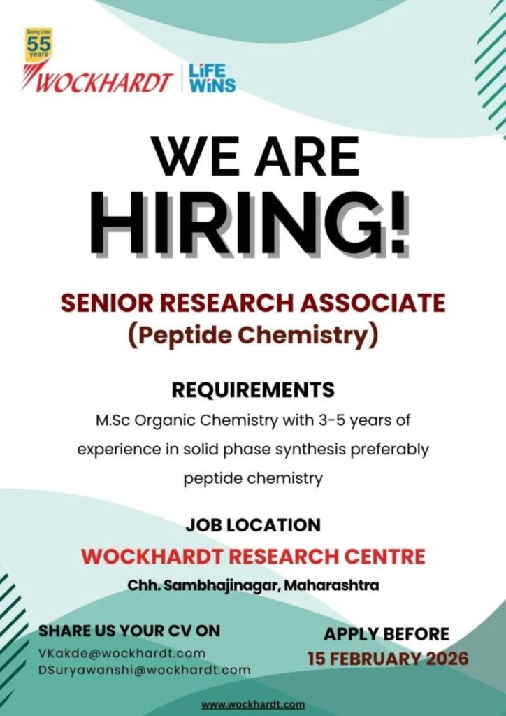Wockhardt Research Centre has announced a new hiring opportunity for experienced chemistry professionals. As per the official notification, the company is recruiting for the role of Senior Research Associate (Peptide Chemistry) at its Maharashtra research facility.
